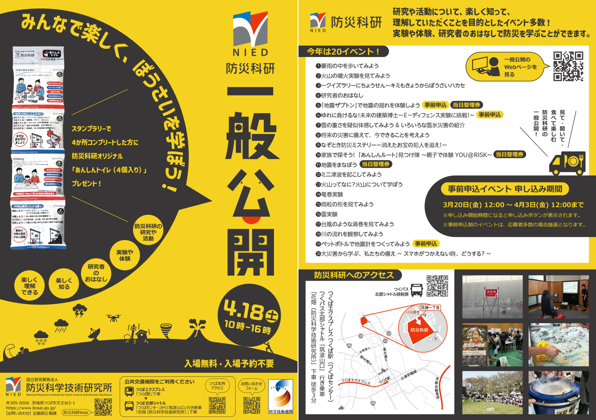 防災科学技術研究所 つくば本所では、「みんなで楽しく、ぼうさいを学ぼう!」をテーマに、一般公開を開催いたします。自然災害の研究者による実験やおはなし、工作や体験イベントなど、楽しみながら防災を学べます。