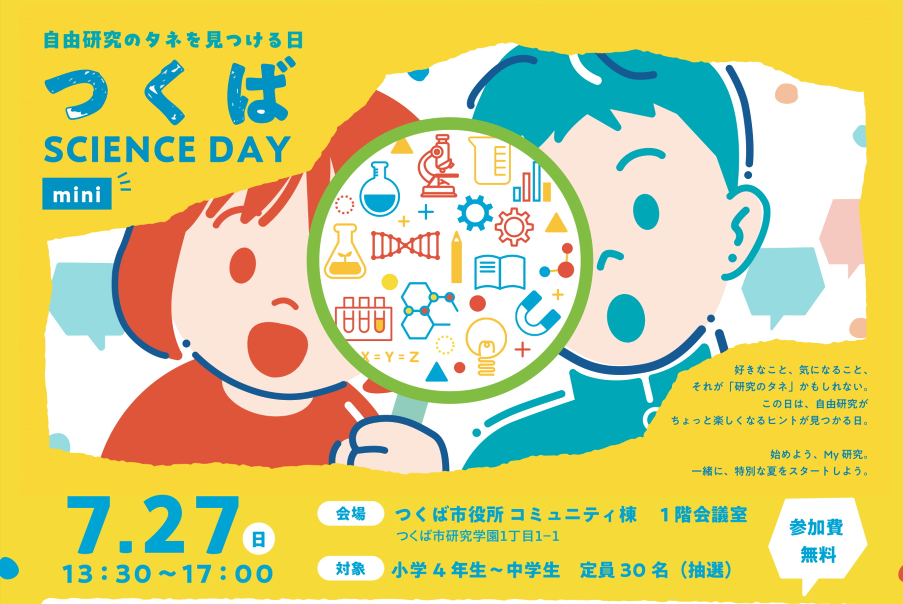 自由研究って「何をやったらいいかわからない…」「途中であきちゃう…」そんな子どもたちの声にこたえる研究マインド/ 研究プロセスを学ぶ体験イベントをつくば市が開催します! このイベントでは、実際に研究活動される研究者のお話を聞いたり、自分だけの研究のタネを見つけ、考えるワークを行います! 当日のゴールは、参加者の皆さんにMy 探究アイデアを持ち帰っていただくものとします。