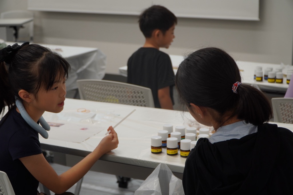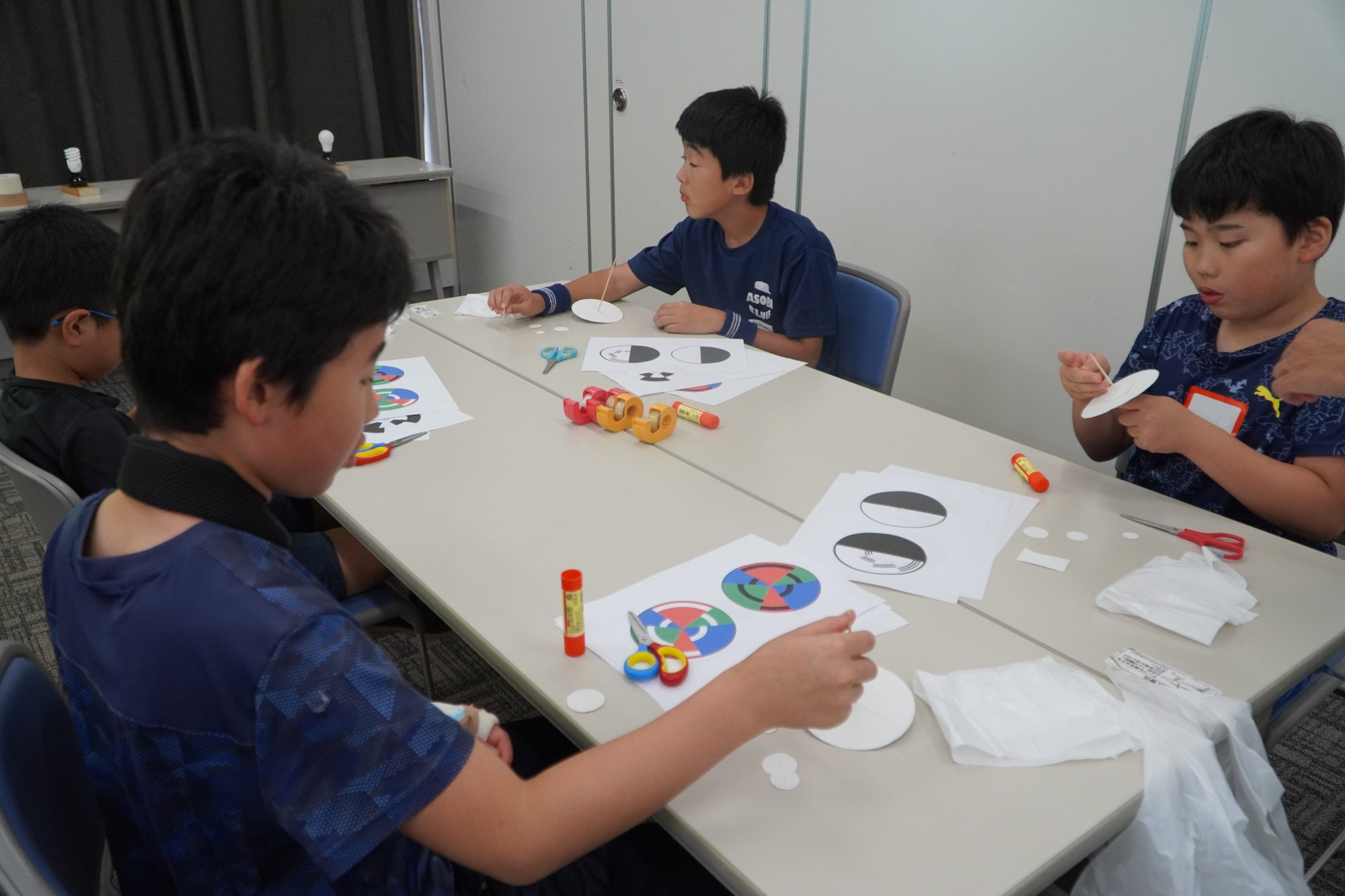 子どもたちは夢中になって工作をしていました。作って終わりではなく、それを使って色の見え方や光の構造について学んでいました。